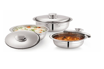 Steel Finish Premier Serving Bowl Set of 3 Pcs, used for mainly Cook & Serve.Size - 14,16,18cm. Capacity : 1000 Ml, 1500 Ml, 2000 Ml.