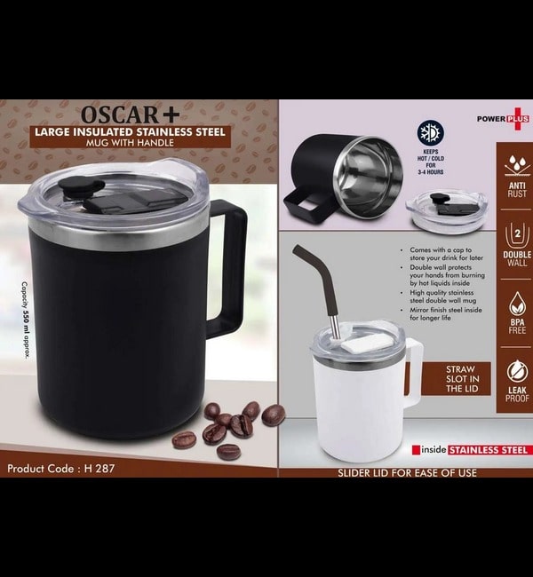 Oscar+: Large Insulated SS coffee mug with handle | Clear cap with Slider Lid | Straw Slot in cap | Capacity 600ml approx