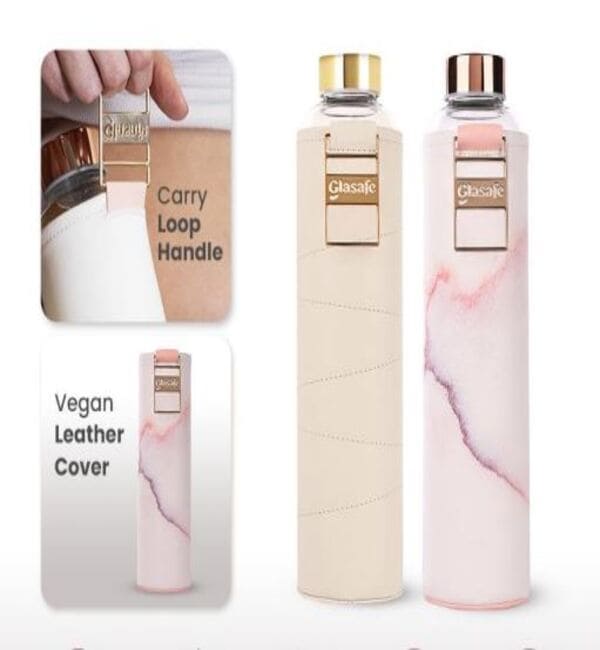 Comes with a carry loop handle, Wrapped in vegan leather for grip and style, Made from 100% borosilicate glass, BPA-free and leak-proof, Sustainable material choice, Dishwasher safe, Combo includes 2 bottles (750ml each), Available colors: Bare Beige and Coral Peach